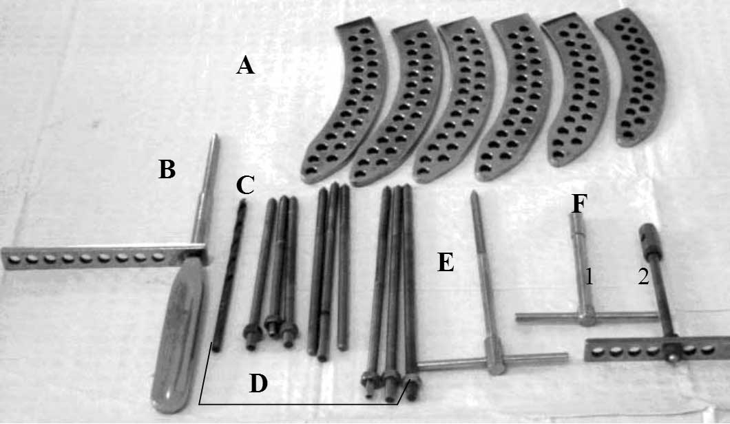 НЕОБХОДИМОЕ ОБОРУДОВАНИЕ И ИНСТРУМЕНТЫ Чрескостный остеосинтез бедра спице-стержневым аппаратом следует выполнять на ортопедическом операционном столе, который дает возможность проводить скелетное вытяжение за дистальный метафиз бедра либо винтовой тягой, либо грузами, в положении сгибания в коленном суставе. Обязательна возможность выполнения рентгенографии в операционной. Необходимым условием для успешного применения метода чрескостного остеосинтеза является наличие достаточного комплекта деталей для остеосинтеза по Илизарову, необходимы, в частности: Кроме того, необходимы цилиндрические резьбовые стержни диаметром 6 мм и длиной 120-220 мм (Рис. 1D). Рабочий конец стержня, вводимый в кость, имеет самонарезающую резьбу M6?1,5 на протяжении 50-60 мм, на остальной части стержня имеется обычная резьба М6, что позволяет крепить стержень с помощью стандартных деталей, входящих в набор для остеосинтеза по Илизарову. Если стержни не самонарезающие, следует использовать соответствующий метчик (Рис. 1E) во избежание раскалывания диафиза. В качестве опор для фиксации стержней используются изготовленные из бедренных дуг радиусные планки с двумя рядами отверстий (Рис. 1A). Для введения стержней необходимы: <ПРЕДОПЕРАЦИОННАЯ ПОДГОТОВКА | ОБЕЗБОЛИВАНИЕ>