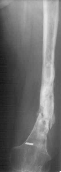 Если инфекция присутствует (вполне возможно, судя по рентгенограмме), резекция инфицированной, некротизированной кости, замещение образовавшегося дефекта с помощью транспорта костного блока в аппарате.