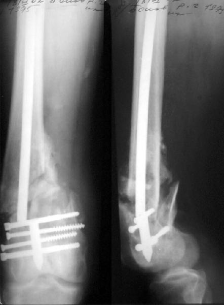 из Пациент 27 лет оперирован 2.04.02 через 2 недели после открытого перелома дистального отдела бедренной кости (1 снимок). Сделан антеградный закрытый интрамедуллярный остеосинтез UFN 11 мм (2 снимок). Вторая нога была ампутирована по месту первичного поступления. Для возможности ранней нагрузки использованы блокирующие винты 6 мм, для чего дистальные отверстия были рассверлены. К двум месяцам начал вставать на костыли, до того занимался разработкой движений в колене. Эти циклические движения в сочетании с тем, что зона концентрации нагрузок приходилась как раз на уровень отверстия, и что перелом открытый и тяжелый и не успел прочно схватиться, привели к перелому стержня 8 июня (3 снимок). Вчера госпитализировали. Такое осложнение у нас впервые. Пока думаем про реостесинтез - вытолкнуть дистальный отломок через дистально, да и через то же отверстие заштифтовать ретроградно. Или наложить аппарат после удаления центрального отломка стержня, если что-то не будет получаться. Или подумать про пластинку? Заранее спасибо.