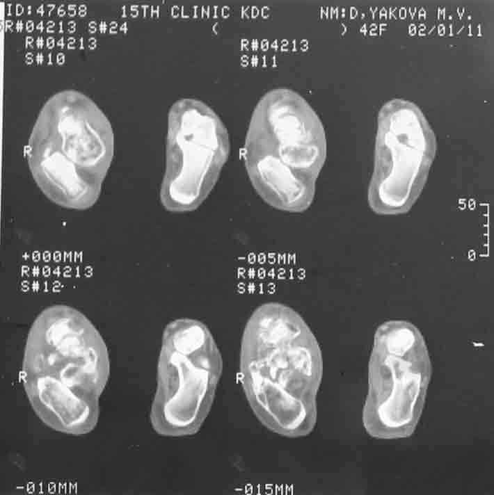 из Больная, 41 год, продавец, поступила в плановом порядке. Травма 1 год назад, вышла из двери второго этажа недостроенного дома с высоты 3 м. ДЗ. закр. перелом обеих лодыжек со смещением. Оскольчатый перелом пяточной кости. Вывих пяточной кости в подтаранном суставе кнаружи. При поступлении наложено вытяжение за пяточную кость 27.07 под в/в наркозом попытка устранения вывиха в подтаранном суставе (растягивался голеностопный сустав) безуспешна. Наложен гипс. В последующем развился некроз кожного лоскута в области внутреней лодыжки 4х5 из-за натяжения кожи над внутренней лодыжкой. Консервативное лечение некроза кожи.Рана в области внутренней лодыжки зажила вторичным натяжением. В настоящее время Больная ходит на костылях с минимальной нагрузкой. При ходьбе беспокоят боли в стопе по подошве, в среднем отделе стопы, в области голеностопного сустава, переднего отдела стопы. Местно: имеется вальгусная деформация заднего отдела стопы, по внутренней поверхности стопы рубец - результат заживления раны вторичным натяжением, при пальпации резкая болезненность по подошвенно-внутренней поверхности стопы, движения в подтаранном суставе отсутствуют, при попытке их совершить появляется боль в проекции подтаранного сустава, сгибание разгибание в голеностопном суставе сохранены, болезненность появляется в крайних положениях сгибания-разгибания, имеются пронационные супинационные движения в голеностопном суставе. ДЗ Сросшийся со смещением перелом обеих лодыжек, подвывих книзу, сросшийся со смещением перелом пяточной кости вывих пяточной кости кнаружи. Коллеги, поделитесь мнением, что делать в такой ситуации? Снимок 1 Снимок 2 Снимок 3 Снимок 4 С уважением Коробушкин Глеб.