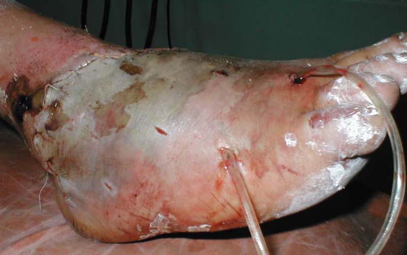 Мужчина, 48лет. Производственная травма (на стопу упал груз весом 2 тонны+химический ожог щелочью). Диагноз: комбинированная травма правой стопы, обширная рвано-скальпированная рана, химический ожог II ст. до 1% поверхности тела, закрытый перелом ладьевидной и I клиновидной костей. Ургентно произведено: ПХО, дренирование, иммобилизация задней гипсовой лонгетой; назначено: обезболивание, реополиглюкин, цефазолин, метрогил, курс ГБО. Вопрос: тактика лечения (дополнения и проч.)?Заранее благодарен! Фото 1 Фото 2 Фото 3 Фото 4 С уважением,А.В.ВладзимирскийДонецкий НИИ травматологии и ортопедииДонецк, Украина