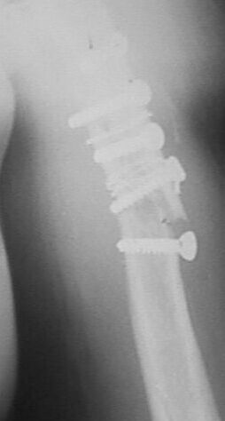 Перелом 7 мес. назад, формируется псевдоартроз. По мне, слишком много "железа" в месте перелома. Особенно мешают проволочные петли, метод древний