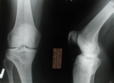 Больная жалуется на боли по медиальной поверхности сустава, клинически варусная деформация, рентгенологически примерно 10 градусная разница по сравнению с левой б/берцовой костью, хотя, допускаю, что причина болей все же повышенная нагрузка в связи с неопороспособностью левой н/к.