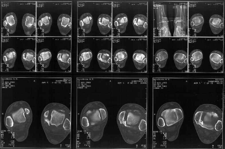 На КТ я попытался изобразить скромными своими способностями (А)- место перелома, (С)- нормальный суставной зазор меж тараном и тремя его маллеолами. (В)- образовавшийся в результате перелома широкий раза в три зазор, позволяющий, по-моему, сублюксацию тарана при ходьбе. В свете данных КТ, критически важных, я бы предложил вертикальную остеотомию места перелома