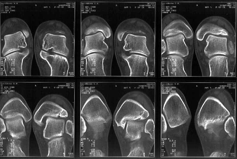 На КТ я попытался изобразить скромными своими способностями (А)- место перелома, (С)- нормальный суставной зазор меж тараном и тремя его маллеолами. (В)- образовавшийся в результате перелома широкий раза в три зазор, позволяющий, по-моему, сублюксацию тарана при ходьбе. В свете данных КТ, критически важных, я бы предложил вертикальную остеотомию места перелома