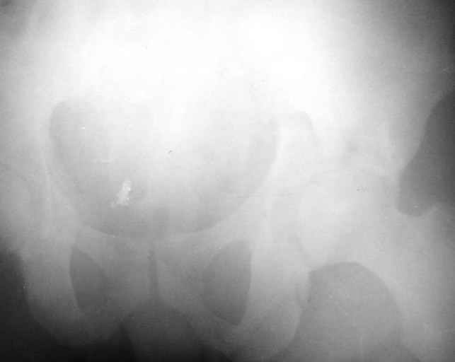 Травма 17 ноября 2002 г., поступил к нам 1 декабря, оперирован 8-го - открытая репозиция, остеосинтез пластинками и винтами. Учитывая повреждение переднего полукольца справа, и крестца и крестцово-подвздошного сочленения слева, наложили аппарат на 2 месяца.