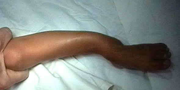 Деформация была выявлена сразу после рождения ребенка и с его развитием усиливается хромота. При ходьбе ребенок полностью наступает на ногу, распределяя нагрузку на внешний край стопы. Нагрузка на ногу безболезненна, данных за травму или инфекцию нет. При осмотре кожных покровов отмечаются характерные пигментные пятна cafe au lait. Совокупность данных анамнеза и осмотра наводит на мысль о нейрофиброматозе с врожденным псевдоартрозом б\б кости. Рентгенограммы прилагаю. Заранее признателен за высказанные мнения по тактике лечения ребенка. С наилучшими пожеланиями, Евгений Чекашкин