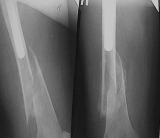 Больному рекомендовали ходить приступая на конечность, отмечает усиление болей, появление укорочения. На контрольных рентгенограммах 19.05.03 рис 3 имеется перелом бедра со смещением, появлением периостальной мозоли. Больной ходит на костылях, приступая на конечность. Сгибание в т\б суставе 90 гр , сгибание в коленном суставе до 90 гр в положении стоя на костылях. Есть несколько вариантов. 1. Провести открытую репозицию фиксацию пластиной с проведением винтов на уровне ножки протеза через кортикальный слой. 2.Провести открытую репозицию фиксацию винтами с межфрагментарной компрессией. Думаем, как выполнить репозицию перелома по длине. 3. Наложить кокситную повязку до окончательного сращения перелома 4. Провести скелетное вытяжение репозицию. Сергей Зырянов Новосибирская область г. Куйбышев ЦРБ
