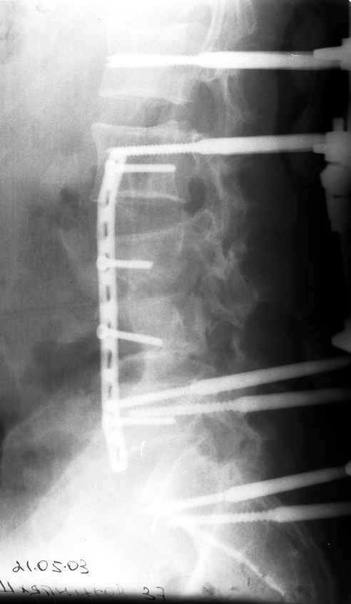 Первым этапом наложен наружный транспедикулярный аппарат, грубая деформация позвоночника устранена. Затем пациент перевёрнут на бок и выполнен забрюшинный доступ по Чаклину. При ревизии обнаружены дислоцированные позвонки "внедрившиеся" в m. psoas. Что интересно, передняя продольная связка хотя и была натянута как струна и отслоена от тел смежных позвонков, но не разорвалась. Ревизия позвоночного канала обнаружила достаточное жизненное пространство для дурального мешка вследствии произошедшей травматической ламинэктомии. Задние отделы повреждённых сегментов переломаны в "крошку". Диск L2-l3 был повреждён поэтому выполнен спондилодез L2-L5. При этом тела 4-го и остатки тела 3-го позвонков использованы в качестве костнопластического метерьяла. Тело 4-го позвонка вертикально и использовано для замещения дефектов на уровне сегментов L3,L4. Для фиксации отломков использована пластина. Стабилность позвоночника обеспечивается АВФ. Неврологическая симптоматика в послеоперационном периоде практически не изменилась. Получает комплексное лечение, планируется в скором времени его вертикализация. < | >