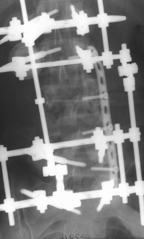 Первым этапом наложен наружный транспедикулярный аппарат, грубая деформация позвоночника устранена. Затем пациент перевёрнут на бок и выполнен забрюшинный доступ по Чаклину. При ревизии обнаружены дислоцированные позвонки "внедрившиеся" в m. psoas. Что интересно, передняя продольная связка хотя и была натянута как струна и отслоена от тел смежных позвонков, но не разорвалась. Ревизия позвоночного канала обнаружила достаточное жизненное пространство для дурального мешка вследствии произошедшей травматической ламинэктомии. Задние отделы повреждённых сегментов переломаны в "крошку". Диск L2-l3 был повреждён поэтому выполнен спондилодез L2-L5. При этом тела 4-го и остатки тела 3-го позвонков использованы в качестве костнопластического метерьяла. Тело 4-го позвонка вертикально и использовано для замещения дефектов на уровне сегментов L3,L4. Для фиксации отломков использована пластина. Стабилность позвоночника обеспечивается АВФ. Неврологическая симптоматика в послеоперационном периоде практически не изменилась. Получает комплексное лечение, планируется в скором времени его вертикализация. < | >