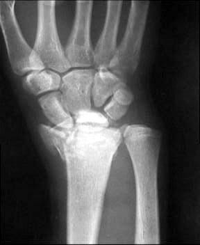Неполный внутрисуставной перелом лучевой, тыльного края (Barton) Наложена гипсовая повязка рис 08 09. Через месяц на контрольной рентгенограмме найдено вывих л\з сустава. Рентгенограмма при обращении в нашу больницу 21 10 03 рис 21 10. На данные момент имеется умеренно выраженная контрактура, умеренные нейровегетативные нарушения. Обдумываем несколько вариантов лечения: 1) Продолжить консервативное лечение и провести артродез, если останется болевой синдром. 2) Провести открытую репозицию, устранить вывих, фиксировать отломок пластиной по тыльной поверхности. 3) Провести артродез в лучезапястном суставе