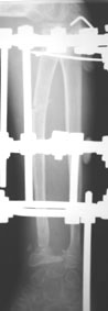 Маленькое замечание: кортикотомия произведена (кажется так по снимку) в невыгодном с точки зрения кровоснабжения кости месте. Дитракция в аппарате приведет к сдавлению не растянутого в аппарате лучезапястного и межзапястного суставов (спица за пястные кости не проведена).