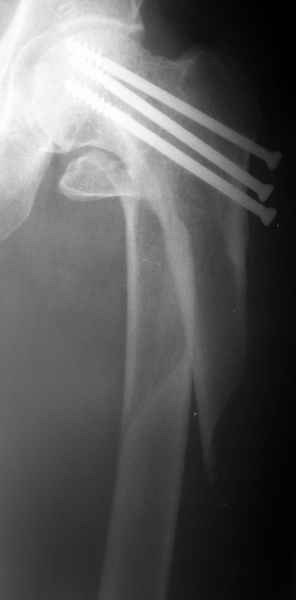 Женшина 69 лет оперирована у нас 2 года назад по поводу перелома шейки. Ходила дома без дополнительной опоры, на улице - с тростью.