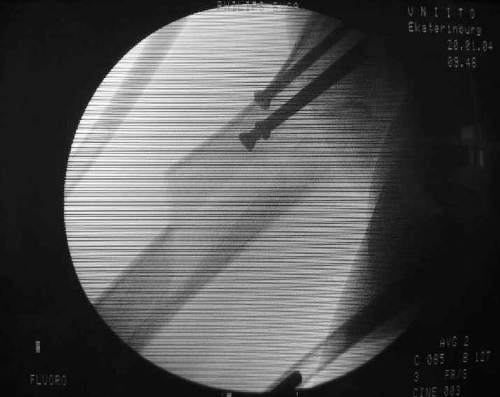 The screws were removed through a stab wound. Then a closed insertion of an unreamed solid nail 13 mm was performed and the nail statically locked - 3 screws 6 mm in the proximal fragment and 1 in the distal.