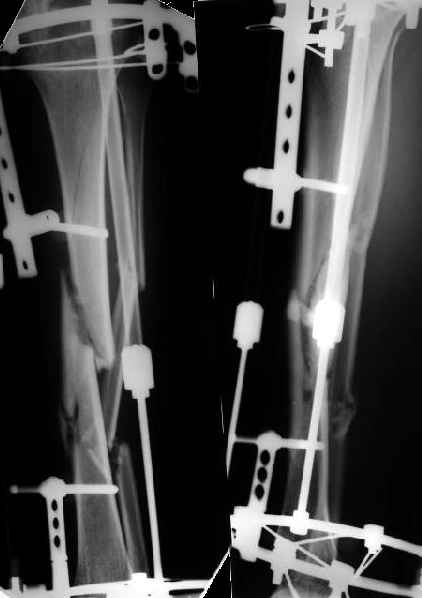 План сейчас - восстановить длину и ось голени. Если колено градусов еще хоть на 20 согнется - заштифтуем, если нет - перемонтируем аппарат для окончательной фиксации. Потом отправим ближе к дому.