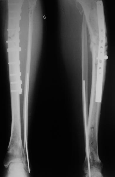 Предлагались разные варианты (коррекция на имеющемся фиксаторе, удаление гвоздя и остеосинтез пластиной, чрескостный остеосинтез...) Выбран был вариант с удалением гвоздя и накостным остеосинтезом. Прошло полгода, больная начала частично нагружать оперированную конечность, будучи в пластиковом ортезе и пользуясь 2 костылями. Две недели назад появилась патологическая подвижность :-( Вчера поступила к нам в отделение. Клинически определяется приличная подвижность, градусов 35 в переднезаднем направлении. На снимках еще видны фиксированная тоникм стержнем уже сросшаяся малоберцовая кость, и тоже сросшийя перелом дистального метадиафиза большеберцовой кости без признаков хирургической фиксации (?). Сегодняшний снимок также в приложении. Планируем удаление пластинки и закрытый интрамедуллярный остеосинтез с рассверливанием. Что скажете, коллеги? Что можно/нужно было сделать, чтобы избежать сегодняшней проблемы? Есть ли другие предложения по нынешнему плану?