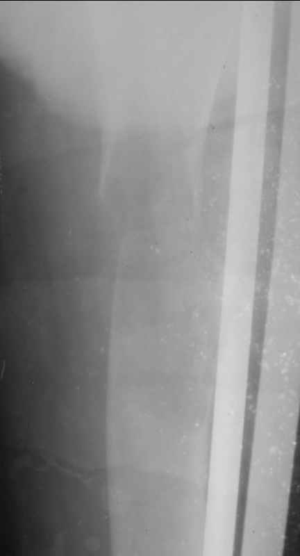 На мой взгляд, рентгенологическая картина все же напоминает солитарную кисту. В похожей ситуации мы выполнили (на фоне патологического перелома) васкуляризованную аутопластику малоберцовой костью на сосудистых анастомозах. Наблюдаем уже более 2 лет. Нагрузка на конечность в полном объеме, боли отсутствуют (рентгенограмма в аттачменте).