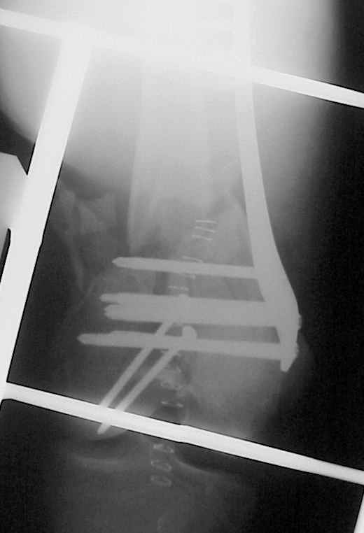 This 40 yo male suffered a car accident on Monday. His lesiones were: - Anterior pneumothorax (minimal) - Left tibia fracture (41-A3.3) closed - Right femur fracture (33-C3.3) open grade III-A On Wednesday we operated him, we used a LISS plate in either bone, when drillind we had the feeling of a 'normal' bone. On Thersday afternoon he was alright, he is a very active man and he was moving well both knees. Later that evening he told me that while he was a little bit asleep he turned on the bed and felt pain and that the femur was loose. Here are the X-rays we took. We are planning to reoperate him on Monday. Removing the screws from the LISS plate and drilling the medial cortex, using locking screws without the drilling tip. Thanks in advance. Dr. Josep M. Muñoz-Vives Hospital Dr. Josep Trueta. Girona Catalonia Spain