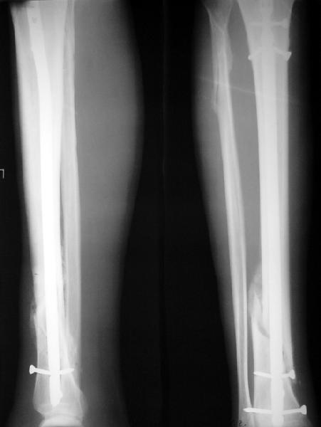 Пример, приведённый Вами в нашей дискуссии по времени нагрузки после остеосинтеза не совсем удачный... Ваш больной имеет счастье, что первым согнулся проксимальный замыкающий винт, а не дистальный и гвоздь не пенетрировал голеностопный сустав.