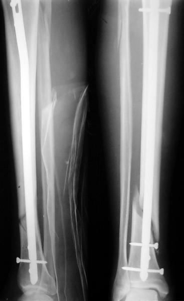 Пример, приведённый Вами в нашей дискуссии по времени нагрузки после остеосинтеза не совсем удачный... Ваш больной имеет счастье, что первым согнулся проксимальный замыкающий винт, а не дистальный и гвоздь не пенетрировал голеностопный сустав.