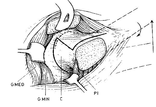 Положение на боку как при протезировании с карманами для конечности, доступ латеральный Koher-Langenbeck, трохантер сзади срезается пилой без отсечения m. gluteus medius and m. vastus lateralis (оттуда название доступа), вскрывается сустав как на рисунке Z-образно, т.е. без повреждения кровоснабжения, в верхнем углу под пириформис поступает верхняя ретинакулярная ветвь, затем вывихивается сустав, конечность укладывается спереди максимально ротируется кнаружи, связка головки срезается без боязни, потому что сохранение medial circumflex collateral artery важно в этом доступе (рисунок).