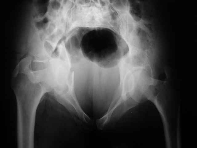На рентгенограммах - высокий двухколонный перелом вертлужной впадины с нарушением конгруэнтности, имеется обратная клиновидность суставной щели.