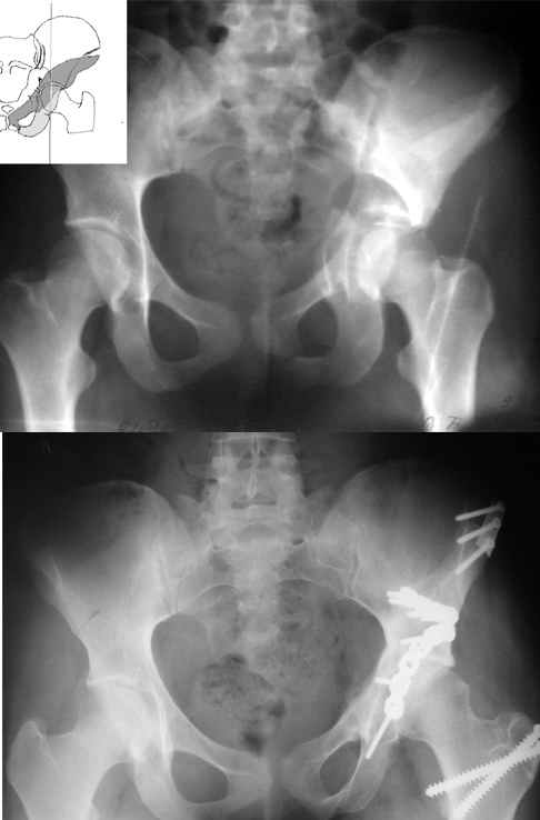 Сначала репонируется гребень крыла на упорной треть трубчатой пластине, затем выводится кнаружи дистальный конец перелома подвздошной кости с фиксацией трансфрактурными винтами или пластиной. Последним задняя колонна.