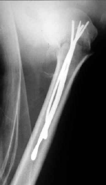 Обычно перкутанной фиксацией спицами я пользовался у детей и подростков при проксимальных эпифезеолизах, концы загибал и погружал подкожно. Но несмотря на *простительные* процессы сращения у детей с удивительной перестройкой костной мозоли, детишки не очень охотно мобилизовали плечевой сустав, в основном активные движения появлялись только после удаления спиц через 3-4 недели. Очевидно, это связано с миофасциодезом дельтовидной мышцы. В обсуждаемой технике миофасциодеза не возникает так как выступающая спицевая петля находится под мышцей, периоссально, обеспечивая свободное скольжение мышечных волокон, а следовательно и свободу движений.