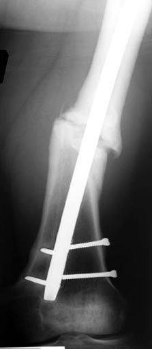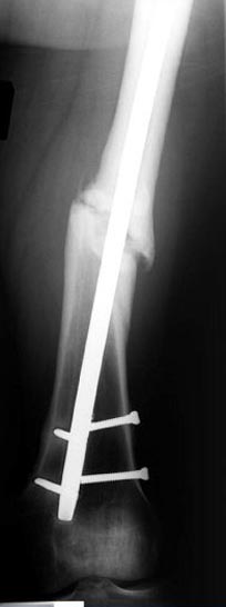Обычный мой первый выбор - вариант с пластиной, - учитывая бывшую инфекцию, открытую травму, посчитал метод менее приемливым.