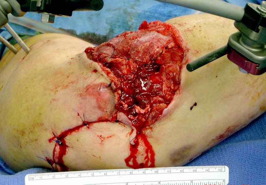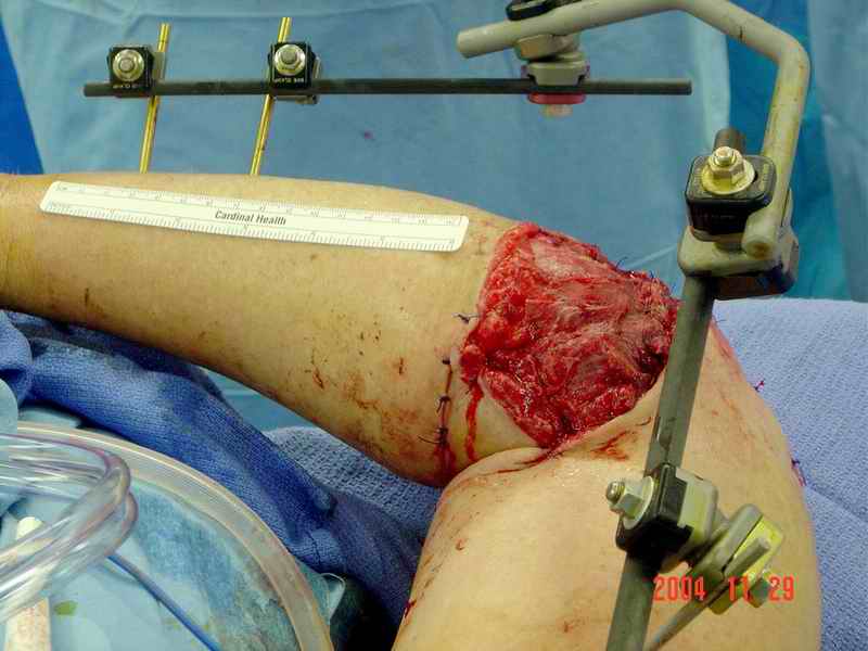 При первичной обработке сделан дебрайдмент, ревизия раны, суставной фрагмент плеча состоящий из трех частей: головчатая и трохлеа, зафиксировал друг к другу двумя спицами, лучевой нерв не работает, но повреждения не было обнаружена на протяжении 13 см, также обнаружен интактный локтевой нерв на протяжении 3 см. Временный наружный фиксатор наложен на верхнюю конечность, ваккумный постоянный отсос на мягкие ткани. Дважды проба из раны на чувствительность аэробную и анаэробную микрофлору - пока отрицательная. Мой план на сегодня, через пару часов: фиксация локтевой кости 3.5 мм локинг пластиной, возможно для стабилизации маленьких дистальных фрагментов и для удержания в олекранон фосса, провести шуруп или спицу, спицы через олекранон, цемент с антибиотиком на месте дефекта и ждать, когда мои коллеги из пластической хирургии закроют рану. Мои партнеры советуют, после заживления - дистальную артропластику или костный графт, но у меня сомнения, некуда зафиксировать в дистальном отделе, у кого другие мнения? Джолдас Кульджанов