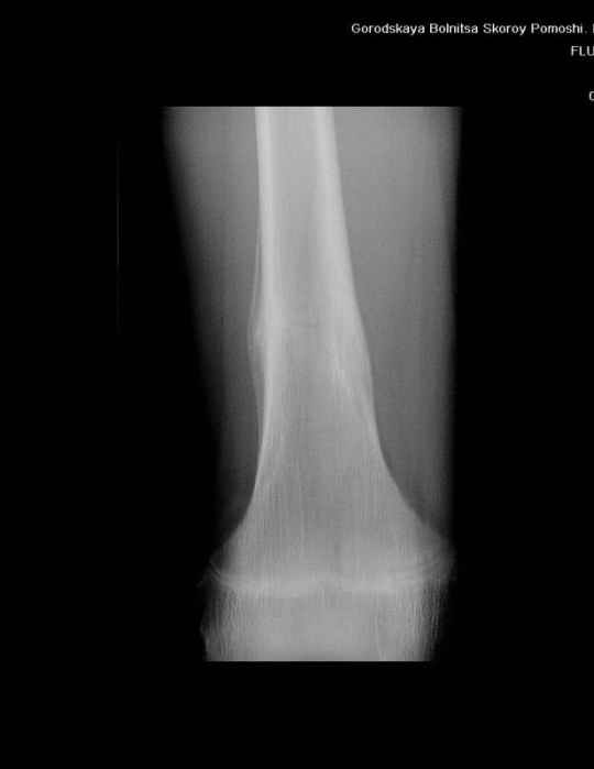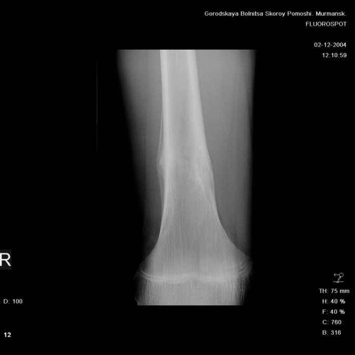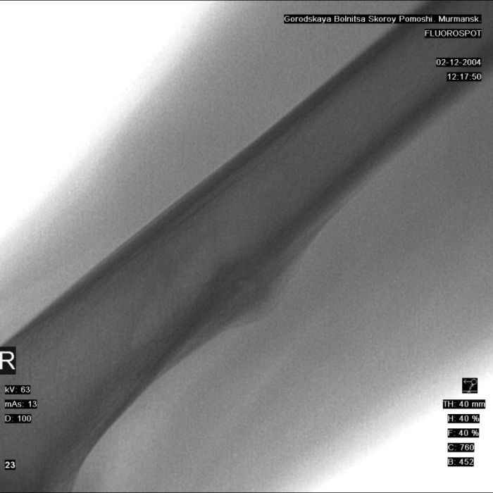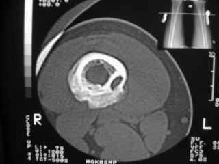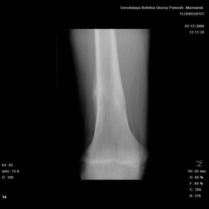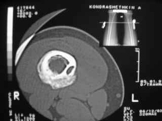 Анамнез практически никакой: в следствие травмы (растяжение связок коленного сустава) от 07.11.2004 выполнены Rg-граммы в травмпункте и обнаружено опухолевидное образование. Первичные Rg-граммы я не публикую, так как они заметно худшего качества, да и динамики за прошедшие три недели не отражают. Болевой синдром купирован в течение трёх дней. В настоящий момент мальчика ничего не беспокоит. Ходьба не нарушена, опухоль пальпируется с трудом по задней поверхности в н\3 правого бедра, пальпация безболезненна, объем движений в суставах правой нижней конечности полный и симметричный. Кожа над опухолью не изменена. В нашей клинике проведено дополнительное обследование: общие анализы крови и мочи, биохимия крови без особенностей. Выполнены Rg-граммы на цифровом Siemens обычные и продольные томограммы срезами 3-5 мм, а также компьютерная томография поперечными срезами по 5 мм. Прошу обратить внимание, что на приведённых томограммах видны две полости 10х15 мм и 15х60 мм. Также имеются два опухолевидных образований наслаивающихся друг на друга: уплощённое и вытянутое 10х100 мм и элипсовидной формы 15х30 мм. Это хорошо заметно на фото a_1.jpg c_1.jpg и d_1.jpg. Плотность внутри полостей 125% от плотности костномозгового канала, плотность наружного опухолевидного образования 55% от плотности кортикального слоя. Также отмечается линия перелома по центру наружного опухолевидного образования. Исходя из полученных данных мнения в плане диагноза несколько разделились от 1)сочетания кортикальной фиброзной дисплазии и латентно протекавшего маршевого перелома н\3 правого бедра до 2)остеосаркомы. В отношении первого варианта не сходится отсутствие клиники при переломе такой крупной кости как бедро, второй вариант вообще оставлю без комментария, ибо некомпетентен. Хотелось бы услышать мнения коллег, с удовольствием ознакомлюсь с любыми предположениями и замечаниями. С уважением, Александр Е. Клоков Отделение детской ортопедии и травматологии БСМП г. Мурманска.