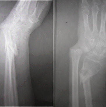 radius fragments with filling the bone`s defect by cancell. bone graft, fixing it by T-plate, and with shortening of ulna.Radioulnar joint must be fixed by screw.
