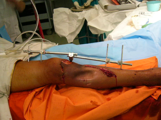Спасибо за рекомендации. Сегодня взял больного на очередную хирургическую обработку и внешнюю фиксацию, картинки в приложении. При обработке опять иссекал ушибленные неркотизированные мышцы, частично кожный лоскут (явные признаки демаркации). связка надколенника разволокнена и выглядит едва ли жизнеспособной, пришлось частично убрать *лохмотья*.