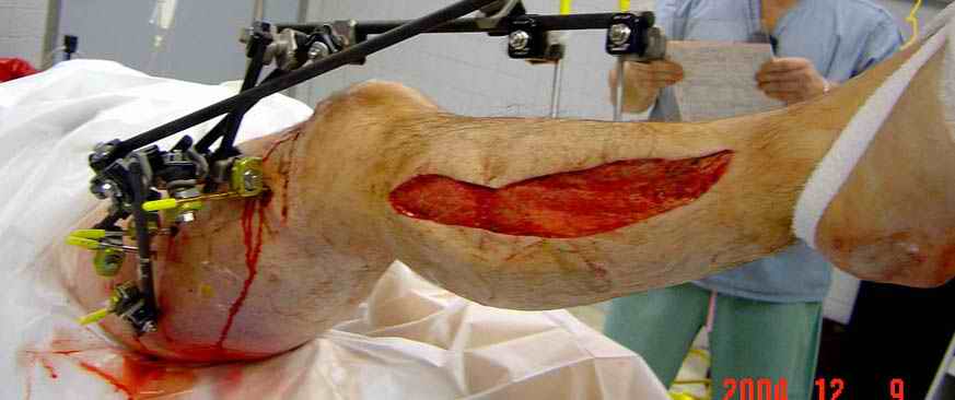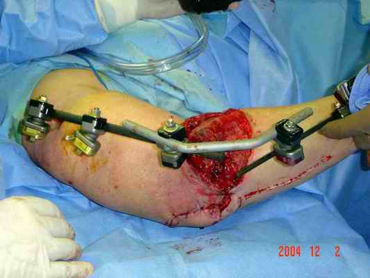 Вторым этапом после 10-12 дней, проводился дебридмент донорского участка и зашивается лоскут на подготовленное ложе после отсечения с одной стороны, одновременная кожная пластика на донорский участок, зашитый лоскут между двумя конечностями страхуется аппаратом или наружным фиксатором любого типа, даже два Steinman pins подходят.