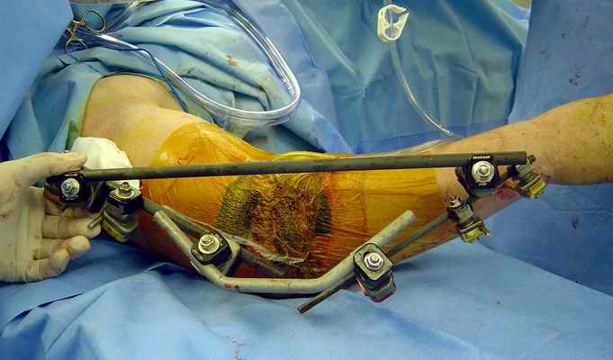 Вторым этапом после 10-12 дней, проводился дебридмент донорского участка и зашивается лоскут на подготовленное ложе после отсечения с одной стороны, одновременная кожная пластика на донорский участок, зашитый лоскут между двумя конечностями страхуется аппаратом или наружным фиксатором любого типа, даже два Steinman pins подходят.