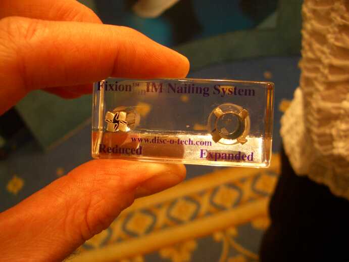 За мной - обещанный долг - рассказ о поездке.Среди участников оротофорума много наших коллег из Израиля, но, возможно, наши с Павлом Ивановым впечатления будут более эмоциональными, поскольку имелась возможность сравнить... 1. КАК ЭТО ПОЛУЧИЛОСЬ.Визит явился продолжением встреч и знакомств на ASAMI (Стамбул, май 2004) и состоялся в первую очередь благодаря энергии и гостеприимству Александра Лернера (медицинский центр Рамбам, Хайфа), который организовал приглашение, размещение, насыщенную профессиональную и культурную программу.И одним из самых ярких впечатлений было радушие, гостеприимство и обязательность наших коллег, которым мы чрезвычайно признательны:Марк Эйдельман, Хаим Штаркер, Михаил Беренштейн, Яков Одесский...Мне бы не хотелось никого обидеть, возможно кого-то не назвал...Но самое теплое отношение развеяло откуда-то сидевшее в душе мнение о прохладных межчеловеческих отношениях в условиях капитализма...Неоднократно ловил себя на мысли - всегда ли мы так же внимательны к нашим гостям? 2. СОБСТВЕННО КОНГРЕСС.Это был ежегодный съезд ассоциации ортопедов. Проходил в Тель-Авиве.В повестке двух дней рассматривались практически все направления современной травматологии и ортопедии (хирургия позвоночника, остеотомии таза, хирургия суставов, кисти, стопы, опухоли, травмы,детская ортопедия...)Из того, к чему был особый интерес и удалось внимательно послушать - травмы, различные виды остеосинтеза, коррекция деформаций...Несколько слов:1. Погружной остеосинтез - блокирующий, накостный...И новинка - интрамедуллярный остеосинтез надувными металлическими стержнями (Израильская разработка).Принцип заключается в том, что стержень вводится в сморщенном состоянии (см. вложение), затем специальным насосом в него нагнетается жидкость, он расправляется, выполняя костномозговой канал, насос снимают, надевают заглушку. Когда удаляют - снимают заглушку, напряжение падает, и он легко извлекается.Были доклады ЗА этот метод, была и его критика. 3. Коррекция деформаций. Метод CORA (Dror Paley) - это почти религия…И, честно говоря, его стоит знать... Уровень организации - ЧРЕЗВЫЧАЙНО ВЫСОКИЙИ ещё - cтрана маленькая, все друг друга знают, все данные - в компьютерах. Возможность выдать желаемое за действительное практически отсутствует, хотя не избежать тенденциозности в некоторых направлениях. 3. КАК УЧАТСЯ ТРАВМАТОЛОГИИВ Израиле все учебники - на английском. Из-за ограниченного количества пользователей (их просто мало) учебники на иврите не выпускают.Поэтому все, кто уехал из СССР, вынуждены были учить два языка (иврит и англ) и сдавать непростой экзамен на иврите. Ориентация - на американскую школу. После института (в любой стране) резидентура (то что у нас ординатура) - 4 года. Кстати, в Хайфе мы жили совсем рядом с Технионом (скажем так, технический университет с медицинским факультетом). Пошли в мед. библиотеку. Кроме обычного в любом учреждении исследования на наличие тяжелых металлических предметов, на нас никто не обратил внимания. Просто СВОБОДНЫЙ ВХОД в библиотеку, где весьма приличный набор современных медицинских журналов и книг по всем разделам медицины. Около 20 компьютеров с выходом в интернет (всё бесплатно). 4. КАК РАБОТАЮТРаботают напряженно. Резиденты - как проклятые.Звено выше - практически также, только не так пыльно… Все компьютеры в больнице об
