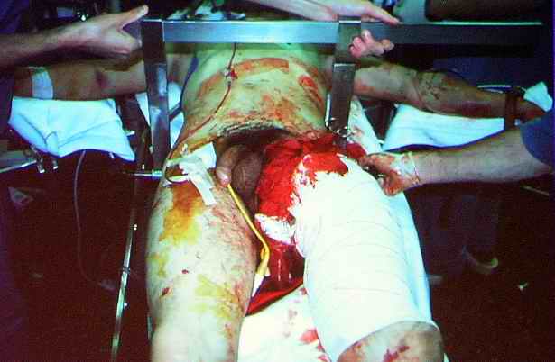 На памяти - троллейбус задним колесом переехал молодого человека на уровне таза. Забрюшинная гематома ваыпирала из лапаротомной раны, плюс отрвы уретры, разрыв кишки пр.