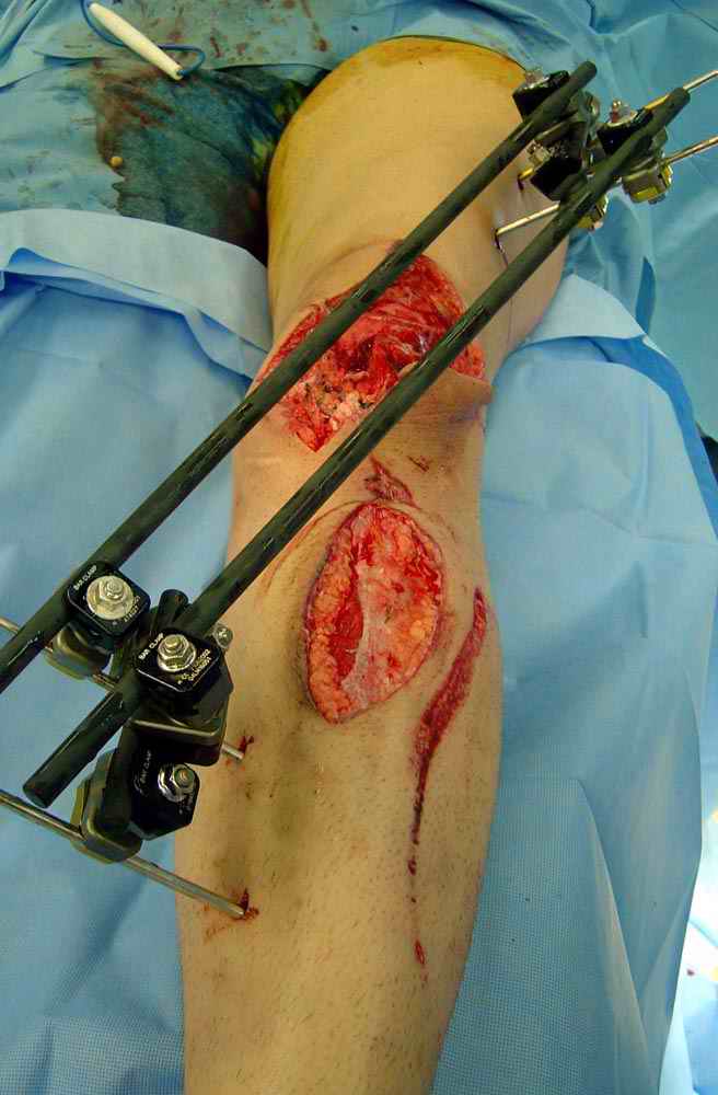 В приемное отделение поступает больная 22 лет, во время аварии ремень безопасности не был пристегнут, в крови большое количество кокаина.В приемном срочная интубация и седация, сделаны снимки.Диагностирован: открытый вывих левого коленного сустава. Дистальная пульсация прощупывается, провели ABI (ankle brachial index) 0.92 до репозиции, 1.00 после репозиции CT chest,spine, brain and abdomen. Заключительный диагноз: Открытый вывих коленного сустава, перелом надколенника, разрыв собственной связки надколенника На операции: Irrigation&Debridment около 10 литров раствора, по два стержня в сегменте, фиксация диагонального, с дефектом, перелома надколенника тремя cannulated 4мм шурупами, ушивание поперечного разрыва связки 5.0 Ethibon sutures, разрыв находился на 2 см ниже надколенника (срез чем-то острым), повторная ирригация раны, взятие посева на аэробическую и анэробическую культуру, окончательная фиксация стержней наружного фиксатора 50см Carbon Fiber Bars, вакуумное закрытие. Мониторинг показал, что компартмент синдрома нет. Через два дня повторение Irrigation&Debridment, в зависимости от состояния раны планируется закрытие раны. С уважением Джолдас Кульджанов