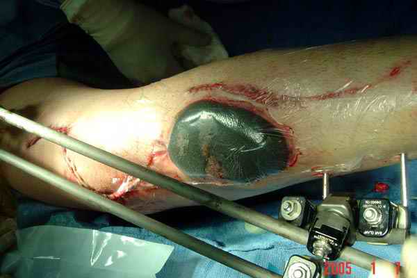 При открытых переломах Type1-2, придерживаемся следующей тактики: дебрайдмент, фиксация перелома и рана прикрывается мокрой повязкой или ваккуум, т.е. не закрываем рану первично!, через два или три дня, в зависимости от состояния раны пройзводим закрытие. При некрозе кожи продолжается иссечение с повторными дебрайдмент.