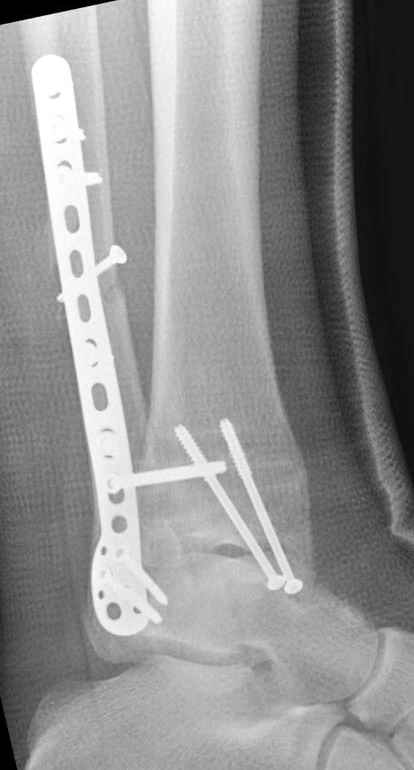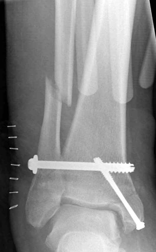 Если до сих ничего не сделано, с артродезом сустава в данный момент я бы повременил, на выставленных январских снимках хорошо сохранившийся сустав, а в "мортиз" (трехчетвертной) и на боковых снимках не менее 5 мм укорочение малоберцовой кости. Косые переломы лучше фиксировать пластинами, как то мы разбирали случай, где было отмечено, что это закон "таранная кость всегда следует за малоберцовой".