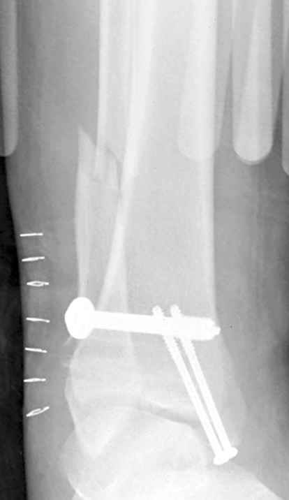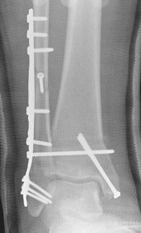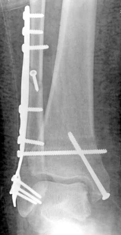 Убедившись, что желаемая длина восстановлена, окончательная фиксация пластины, при этом через пластину пару 3.5 мм шурупов на синдесмоз, предпочтительно в четыре кортекса и оставить на 3 мм длиннее, если под нагрузкой синдесмотический шуруп сломается, сломанный конец легче удалить с медиальной стороны.