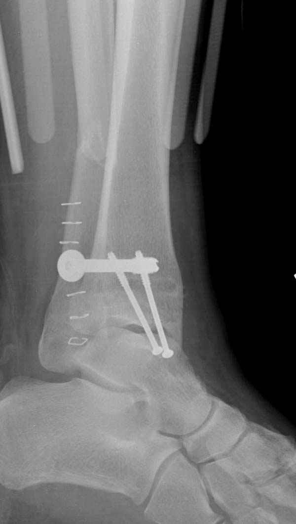 Если до сих ничего не сделано, с артродезом сустава в данный момент я бы повременил, на выставленных январских снимках хорошо сохранившийся сустав, а в "мортиз" (трехчетвертной) и на боковых снимках не менее 5 мм укорочение малоберцовой кости. Косые переломы лучше фиксировать пластинами, как то мы разбирали случай, где было отмечено, что это закон "таранная кость всегда следует за малоберцовой".