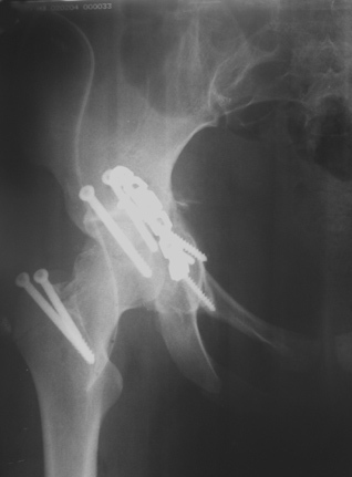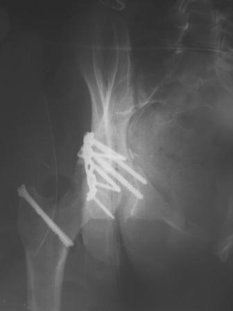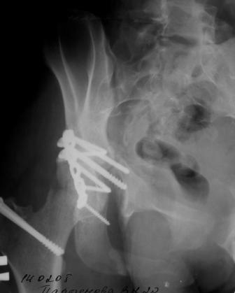 30/11/04 |  30/11/04 |  30/11/04 |  14/12/04 |  14/12/04 |  14/02/05 |  14/02/05 |  21/02/05 | Уважаемые коллеги! Случилось вторичное смещение вертлужной впадины после операции. Посоветуйте, что делать. Пациентка 18 лет. Травма 19.11.04. D.s.: Закрытыый Т-образный высокий перелом правой вертлужной впадины. Закрытый перелом м\мыщелкового возвышения левой б\берцовой кости. 9.12.04 операция - открытая репозиция, остеосинтез переломам вертлужной впадины. 30.12.05 выписаны на амбулаторное лечение с рекомендациями не вставать на правую ногу. 14.02.05 при контрольном осмотре на Р-граммах выявлено вторичное смещение передней колонны. Клинически подвывиха нет, имеется умеренная приводящая контрактура правого тазобедренного сустава, гипотрофия мышц н\конечностей. Госпитализирована в травмотделение. Выполнено КТ. Имеется смещение передней колонны кнутриЮ диастаз 8 мм. Посоветуйте пожалуйста, что предпринять в данной ситуации.
