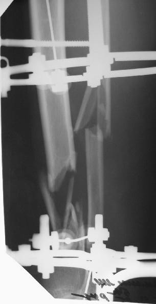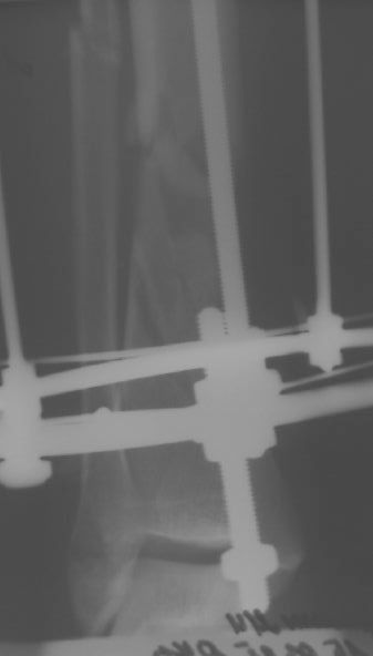 2. Провести остеотомию сегментарную м/берцовой кости напротив дефекта и медленно этот сегмент подвести с помощью спиц в место дефекта. Можно не дожидаться полного заживления ран.