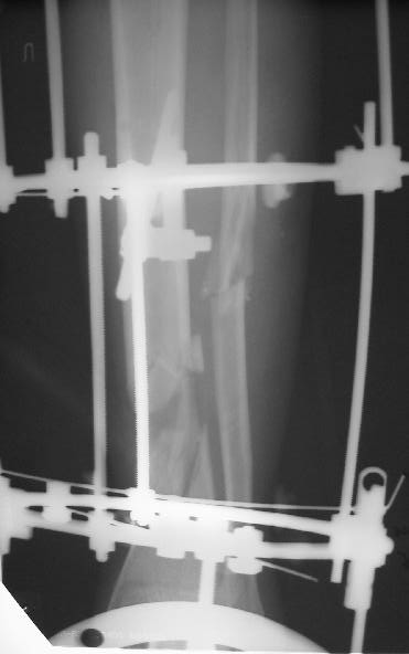 На дополнительных снимках итраоперационно видна значительная потеря массы (рис 6 рис 1). Хотя на снимках контрольных после операции вроде дефекта значительного нет. Все же придется, как-то замещать дефект костный на голени, думаю подготовить морально больного к повторной операции костной пластике, после заживления ран.