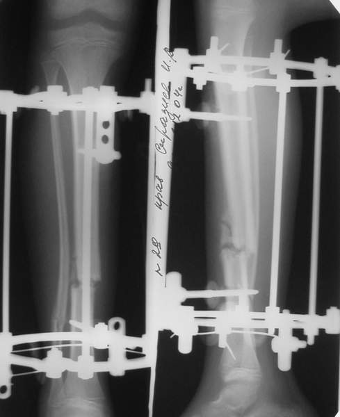 МТ мы используем, конечно, не только на голени. В прилагаемом примере у парня при поступлении была наружная ротация 40 гр. и "полумертвый" коленный сустав. Можно был бы, конечно, до конца использовать полную компоновку. Но для того он и есть метод выбора.