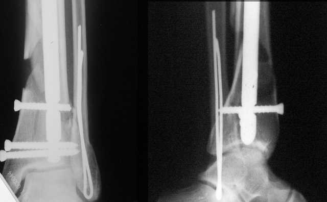 Если недоступны гвозди, специально разработанные для очень дистальных переломов, то всегда под рукой возможность спилить лишнее, чтобы отверстие оказалось на самом кончике.