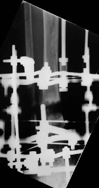 In attachment - x-rays at the end of alignment, the surgery, and result. The nail was cut to 23 cm. Four 45 degree holes were pre-drilled at the distal nail tip. The nail was locked statically