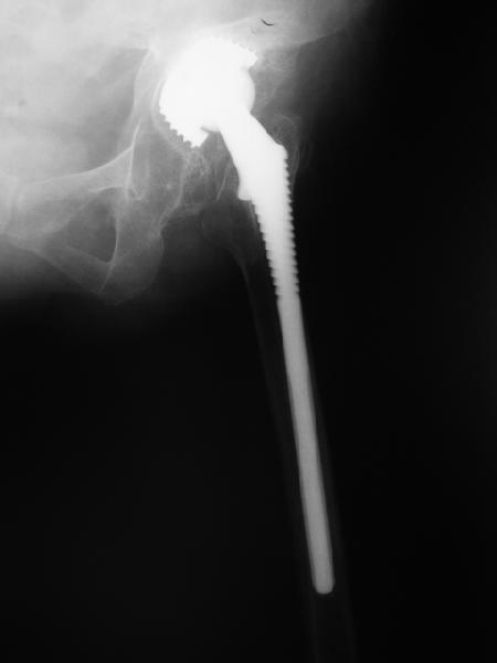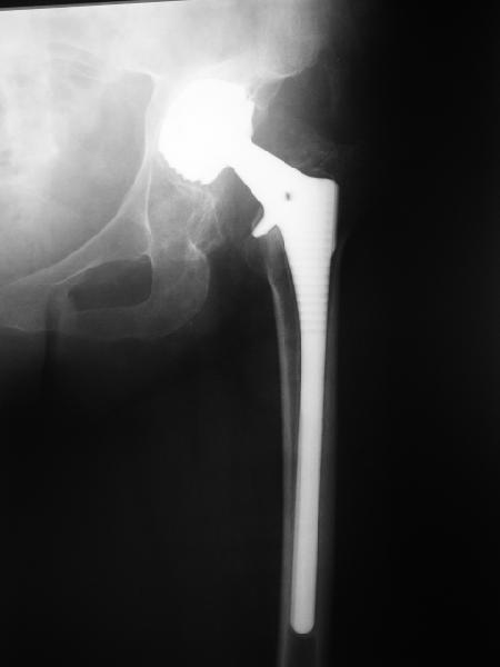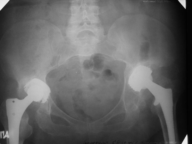 из В наше отделение обратилась больная (родственница одного из сотрудников) 1948 г.р. В 2002 г. тотальное эндопротезирование тазобедренных суставов в Кургане. Все было благополучно до 22 апреля этого года, когда при развороте на фиксированной стопе появилась резкая боль в правом тазобедренном суставе и верхней трети бедра. Конечность стала неопорной. Активные движения - резко болезненны. Пассивные - свободные, безболезненные. Местно - есть зона гиперемии в вертельной области. Пальпаторно - флуктуация (гематома?) по задне-наружной поверхности бедра. Температура субфебрильная. Больная сейчас на постельном режиме, двигаться, а тем более вставать отказывается из-за боли. Снимки прилагаются. Больная обращалась в клинику эндопротезирования Уральского НИИТО, ей было отказано даже в консультации. Вопросы - обязательна ли ревизия протеза? В условиях нашей больницы организовать ревизионное протезирование проблематично. Есть ли возможность и на каких условиях можно вновь попасть в Курганский институт? И про ближайшие дни - надо ли пунктировать область флуктуации? Назначить ли антибиотики? Еще какую-то медикаментозную терапию? Какие-то другие меры? Спасибо. Юрий Валерьевич Антониади Центральная городская больница N24, Екатеринбург.