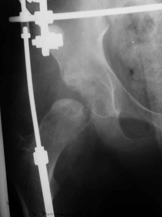 Уважаемые коллеги! Две недели назади мы прооперировали данного пациента: монтаж аппарата таз-бедро (с двусторонней фиксацией за крылья) и постепенная дистракция. Достигнуто низведение бедра.